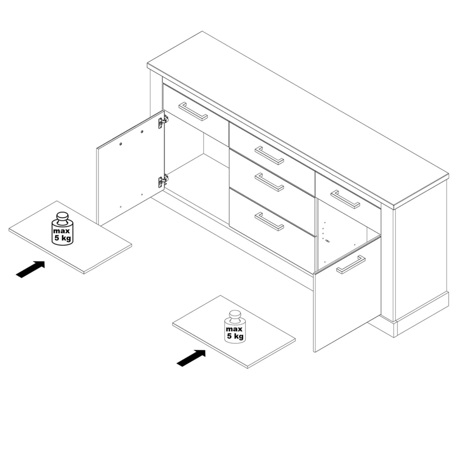 Das Stauraumwunder für Ihren Wohnbereich oder für Ihr Esszimmer in einem hellen Pinie-Weiß mit Absetzungen in Touchwood Nachbildung. Das Sideboard verfügt insgesamt über fünf Schubkästen, die Platz für viele Kleinigkeiten, wie Servietten, Kabel, Kerzen und ähnliches bieten. So sind diese einfach zu verstauen und doch immer schnell griffbereit. Für größere Gegenstände bieten sich die Fächer hinter den beiden Drehtüren an. Diese können durch jeweils einen Einlegeboden in praktische Fächer untereilt werden.