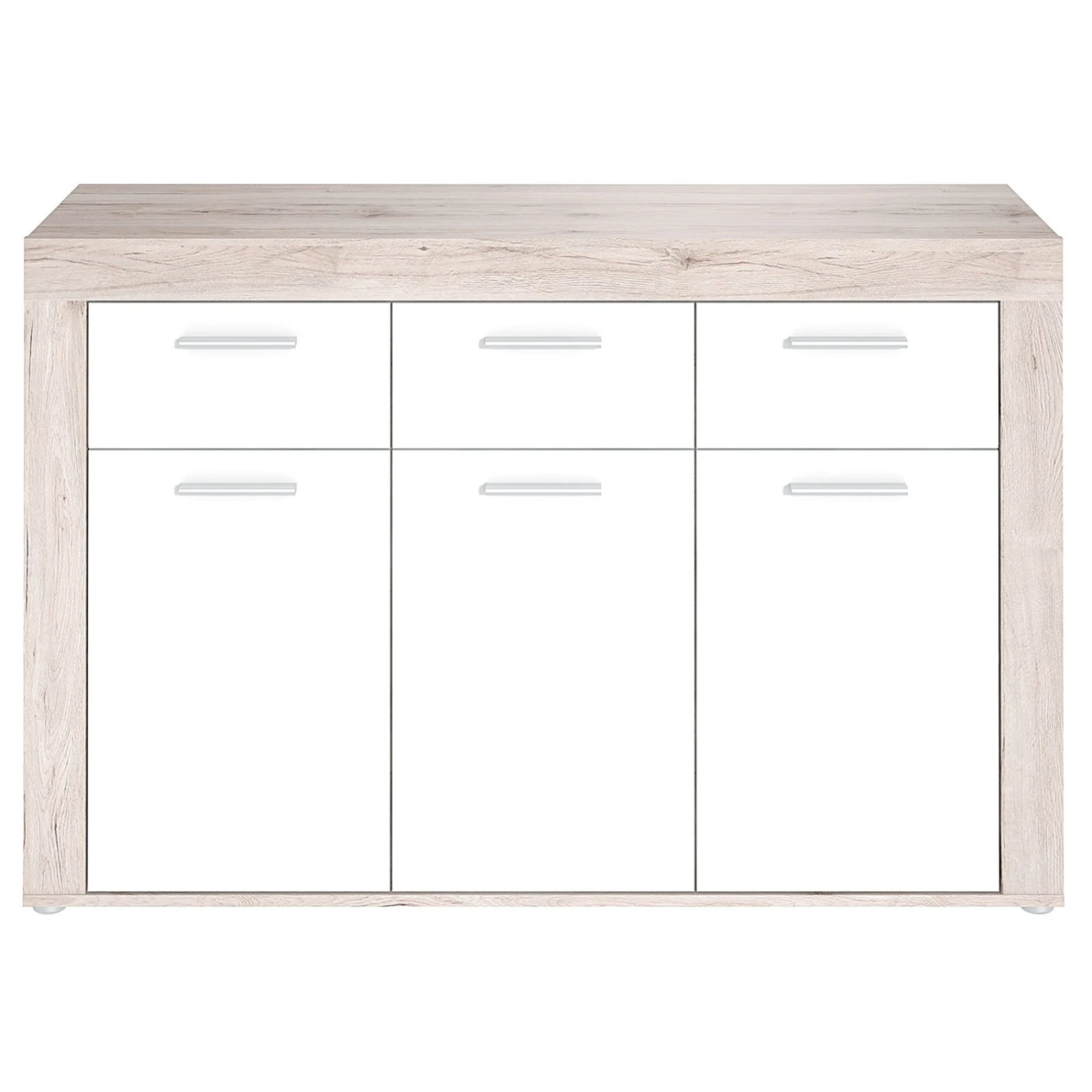 Das Sideboard aus dem gleichnamigen Garderobenprogramm begeistert mit Design und großzügigem Stauraumangebot. Das Sideboard verfügt über drei Türen, drei Einlegeböden und drei Schubkästen. Optisch überzeugt ZUMBA mit Sandeiche Dekor und einer weißen Front.