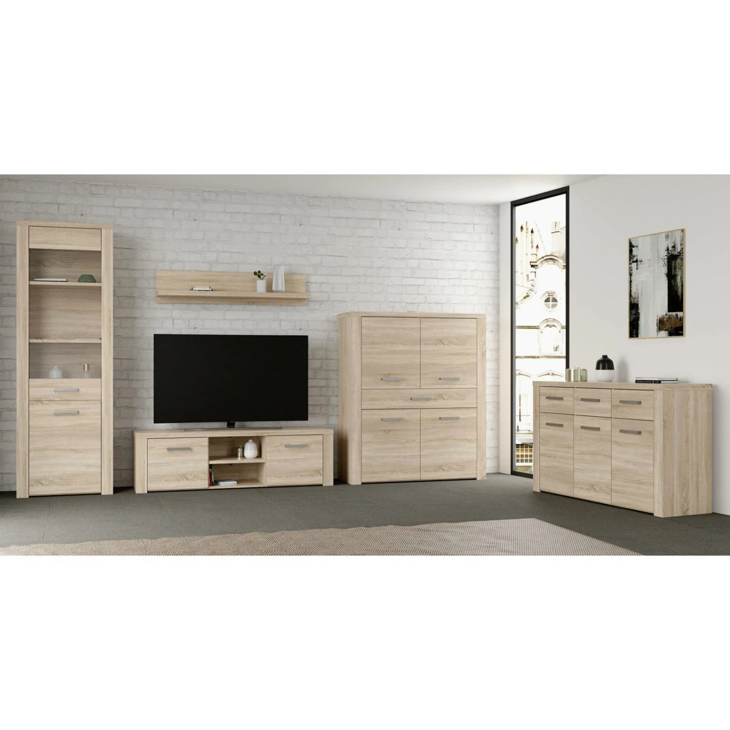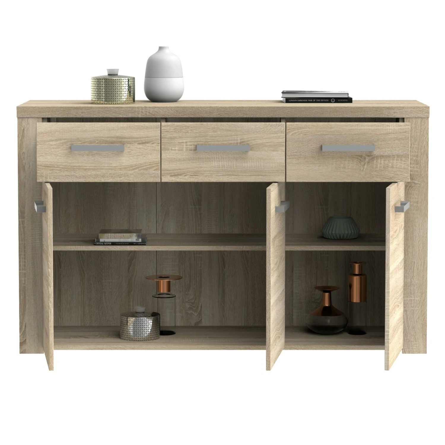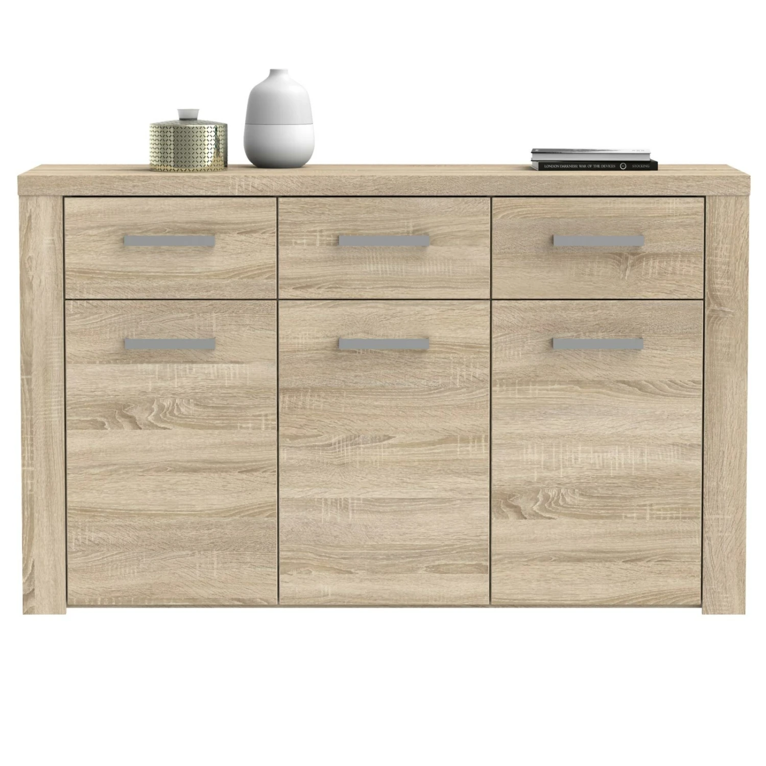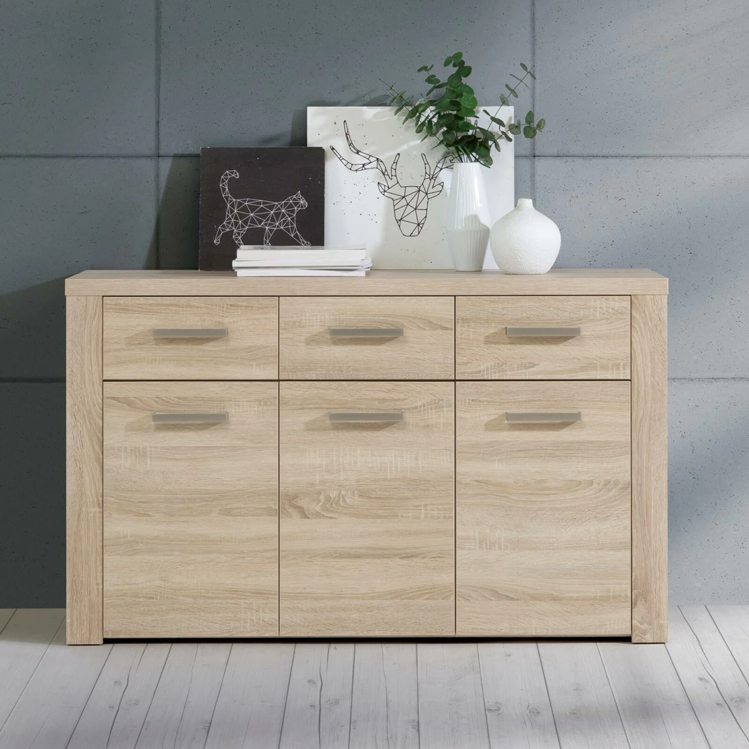 Das etwa 136 Zentimeter breite Sideboard präsentiert sich in zeitloser Sonoma Eiche Nachbildung und fügt sich bestens in die verschiedensten Wohnstile ein. Hinter drei Türen und in drei Schubkästen können Sie die verschiedensten Gebrauchsgegenstände unterbringen und überscihtlich aufbewahren. Die silbernen Metallgriffe harmonieren sehr gut mit dem hellen Holz und runden die tolle Optik noch stimmig ab.