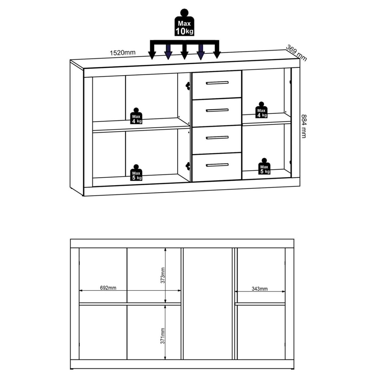 Hinter drei Türen und in vier Schubkästen bietet dir dieses Sideboard reichlich Platz für die verschiedensten Utensilien. Das Möbelstück kann vielseitig eingestezt werden, egal ob im Wohnraum, Schlazimmer oder in der Diele.