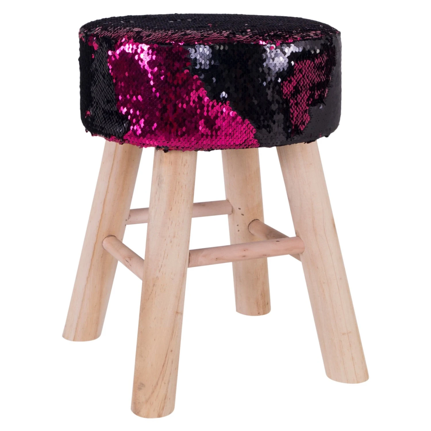 Dieser Sitzhocker verkörpert puren Glamour! Der Paillettenbezug schimmert in den Farben Schwarz und Rosa und ist ein richtiger Eyecatcher. Gepaart mit seinem hellbraunen Kiefergestellt ist der Hocker ideal um die Füße hochzulegen oder in als alternative Sitzgelegenheit zu nutzen.