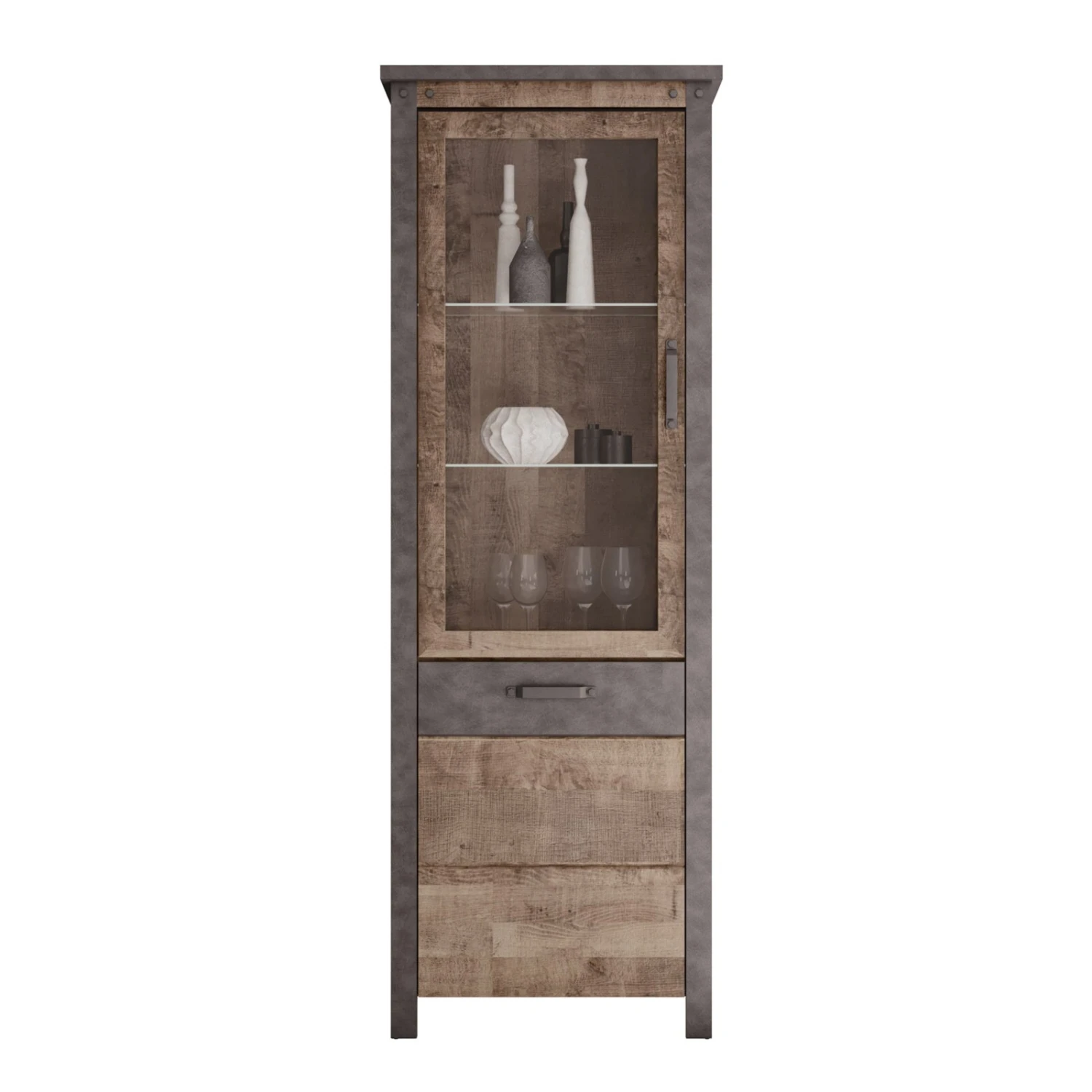 Diese schöne Strandvitrine OLIVER im Industrial-Style wird das neue Highlight in Ihrem Wohnzimmer. Sie ist in Tabak Eiche Nachbildung gehalten und wird abgerundet durch die Absetzungen in Matera Nachbildung. Die Griffe aus Kunststoff sind in Grau gehalten und vervollständigen das moderne Design. Hinter einer Glastür finden Sie zwei Einlegeböden aus Glas, auf denen Sie Ihre Lieblingsstücke in Szene setzen können. Weitere Utensilien können hinter der Holztür verstaut werden.