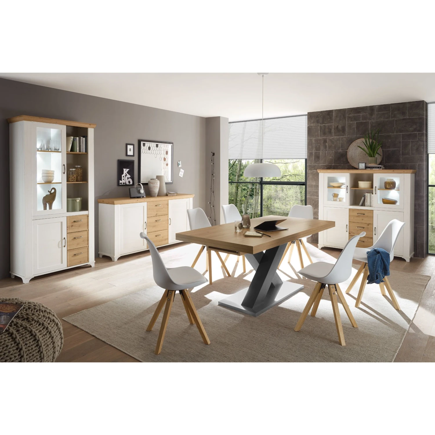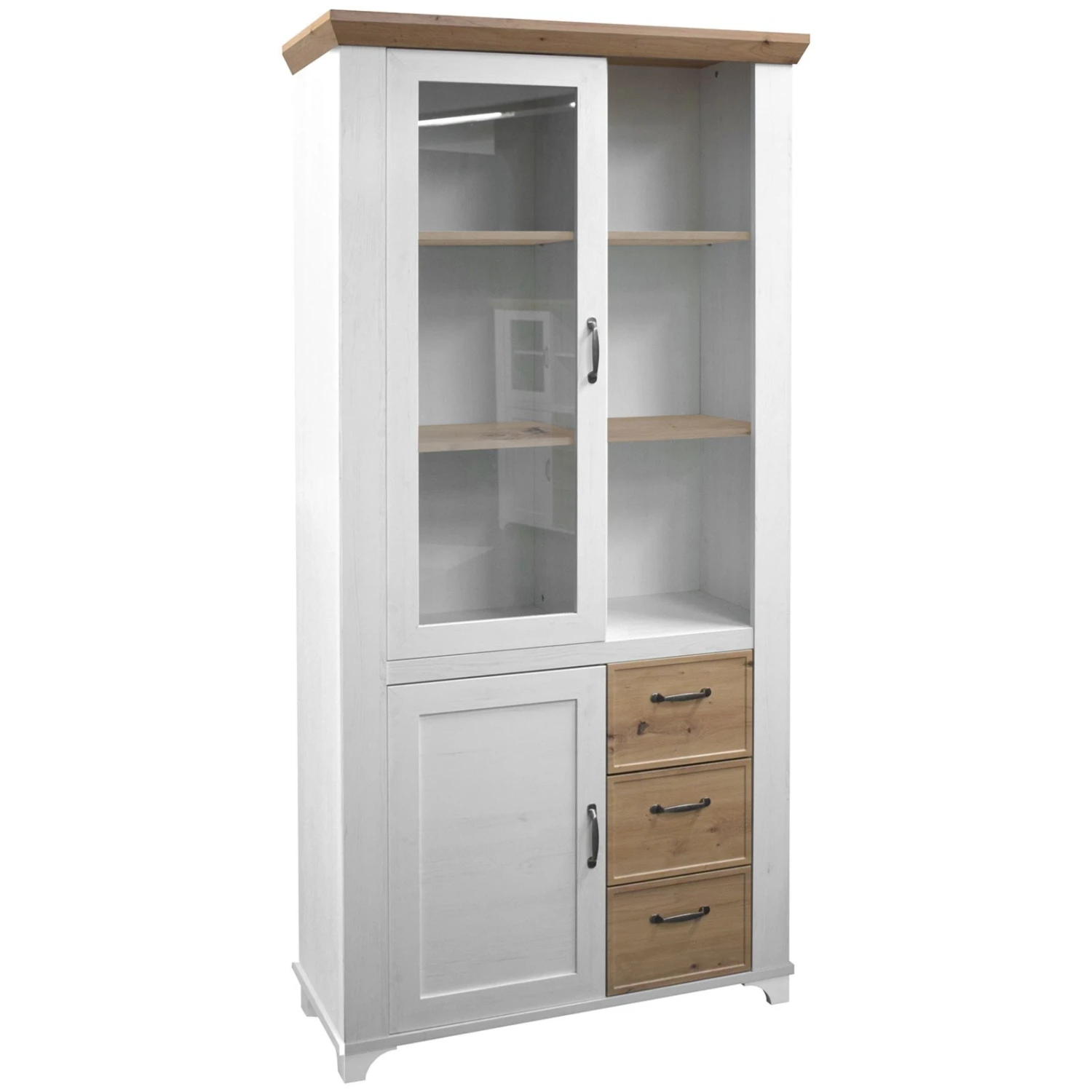 Diese wunderschöne Standvitrine in einem Farbmix aus Anderson Pinie Nachbildung und einer Artisan Eiche Nachbildung überzeugt durch ihre Optik. Die Standvitrine verfügt über zwei Türen sowie insgesamt drei Schubkästen. Mit einer höhe von etwa 201 cm bietet die Standvitrine ausreichend Stauraum.