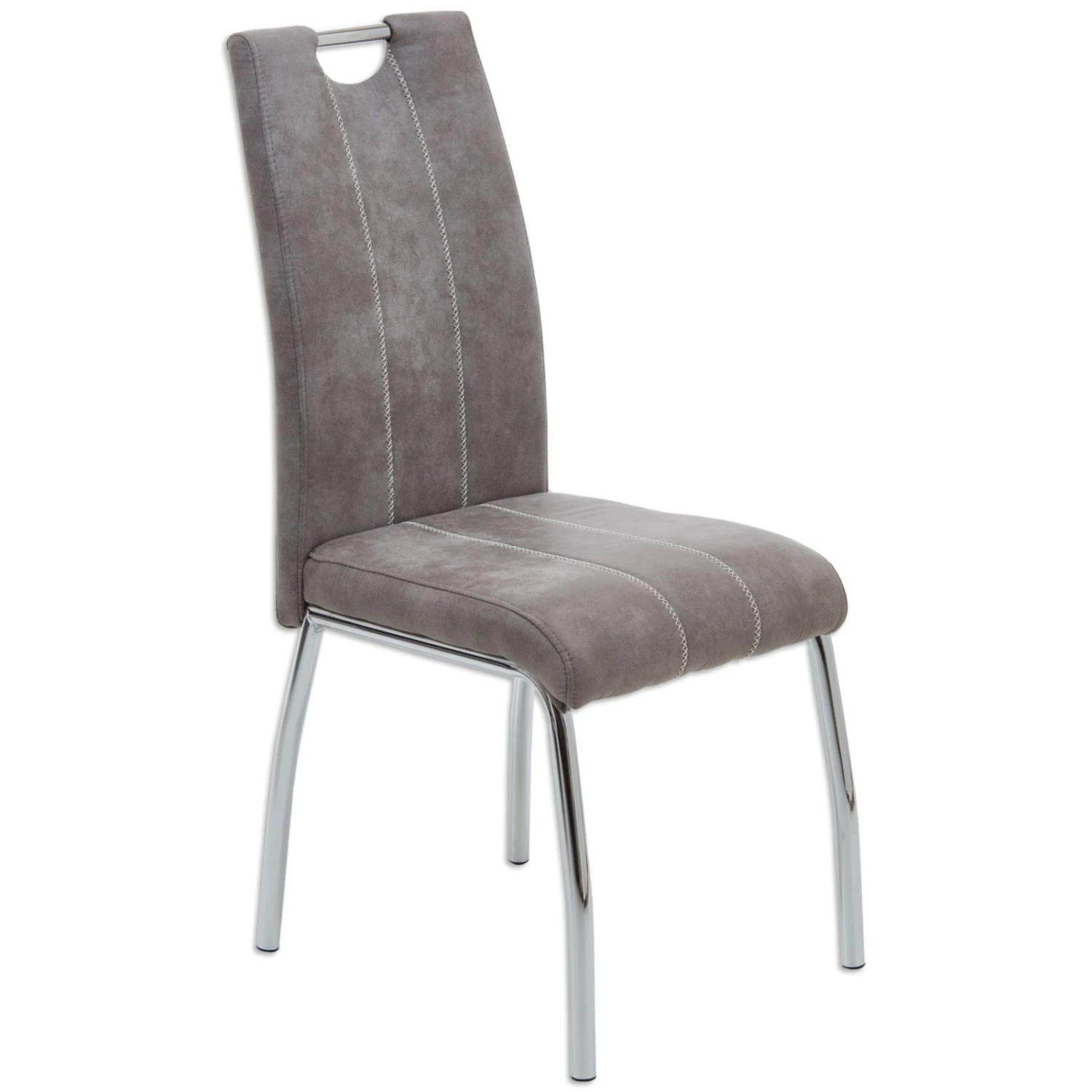 Polsterstuhl in Grau, der durch seine Optik sehr edel wirkt und Ihren Essbereich stilvoll erweitern wird. Sitz und Rücken sind gepolstert und der Bezug wird durch die Kreuznaht toll in Szene gesetzt. Der Griff ist ein optische Highlight und gleichzeitig praktisch, um den Stuhl einfach zu handhaben.