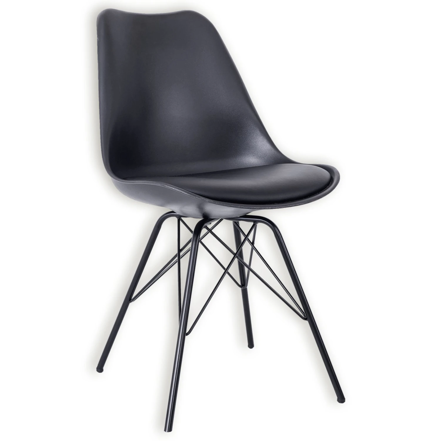 In einem stilvollen Schwarz präsentiert sich dieser Stuhl! Die Sitzschale besteht aus Polypropylen und für mehr Komfort wurde der Sitz mit einem Kunstlederbezug gepolstert. Die maximale Belastbarkeit liegt bei diesem Stuhl bei etwa 110 Kilogramm.
