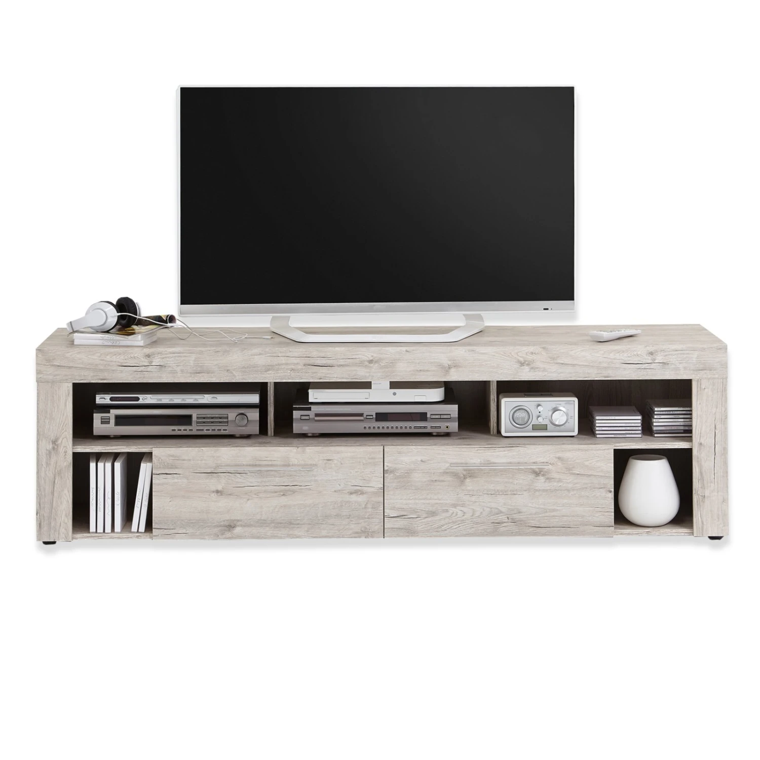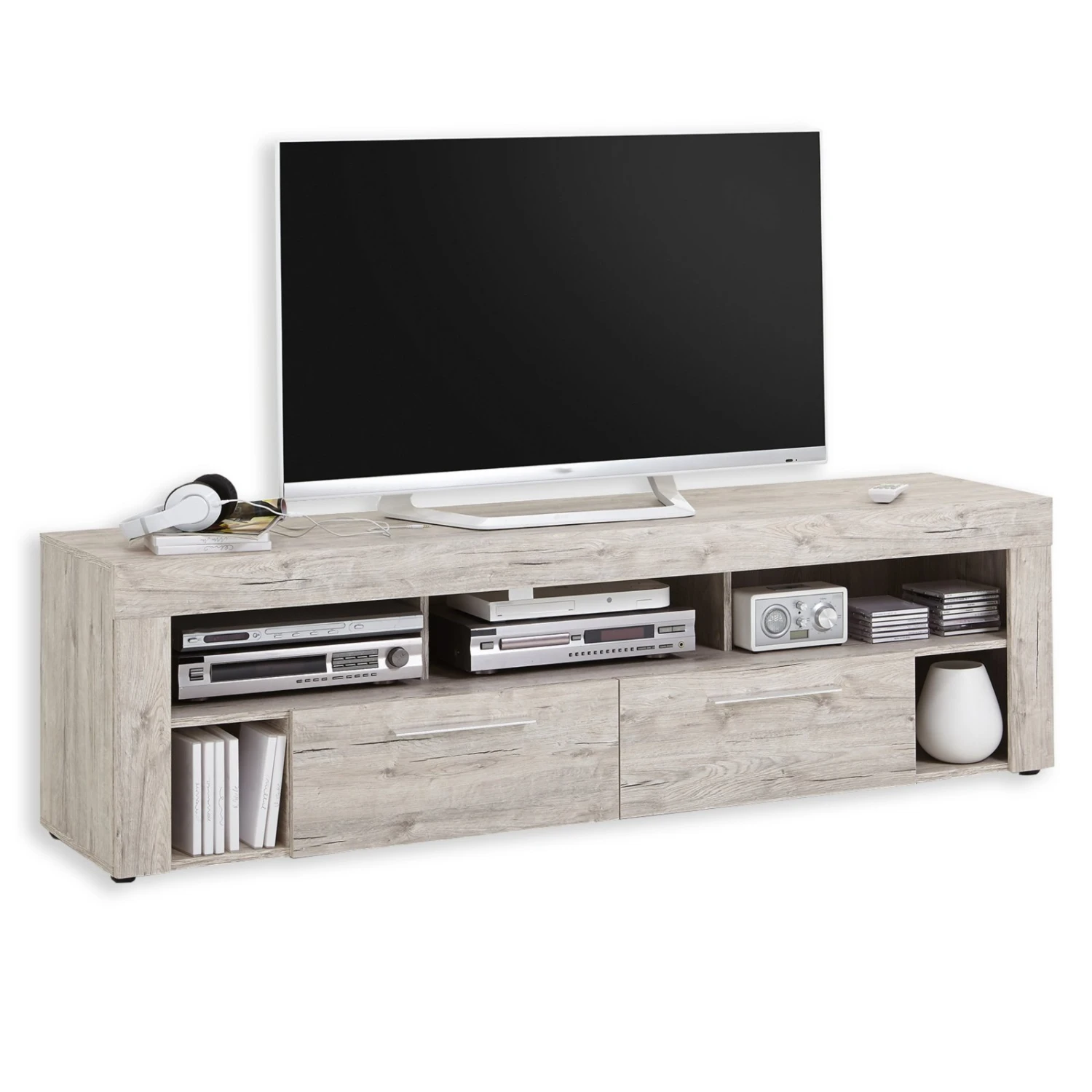 Schönes TV-Lowboard VIBIO in Sandeiche Nachbildung. Zwei Schubkästen und fünf offene Fächer sorgen für genügend Stauraum und auch das Design ist ein schöner Blickfang für Ihr Wohnzimmer. Sandeiche ist vielseitig kombinierbar und verleiht Ihrem Raum eine schöne Wohnatmosphäre.