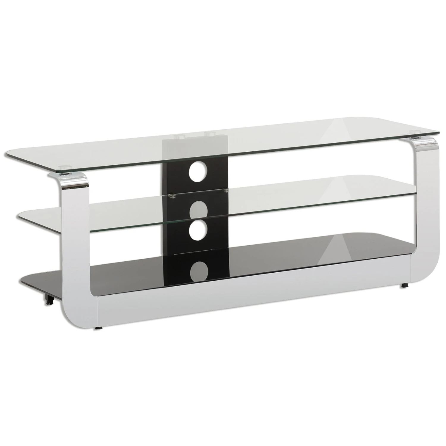 Wunderbar offenes TV-Lowboard. Auf einer Breite von 124 cm stehen Ihnen drei Ablageflächen zur Verfügung. Der Oberboden kann hierbei mit etwa 40 kg belastet werden, der Zwischenboden mit etwa 10 kg und der Unterboden mit etwa 15 kg. Zwei Kabelführungen stehen Ihnen außerdem zur Verfügung, um das unerwünschte Kabel-Chaos ordnungsgemäß zu beseitigen. Die Glasplatten sind aus ESG-Sicherheitsglas.