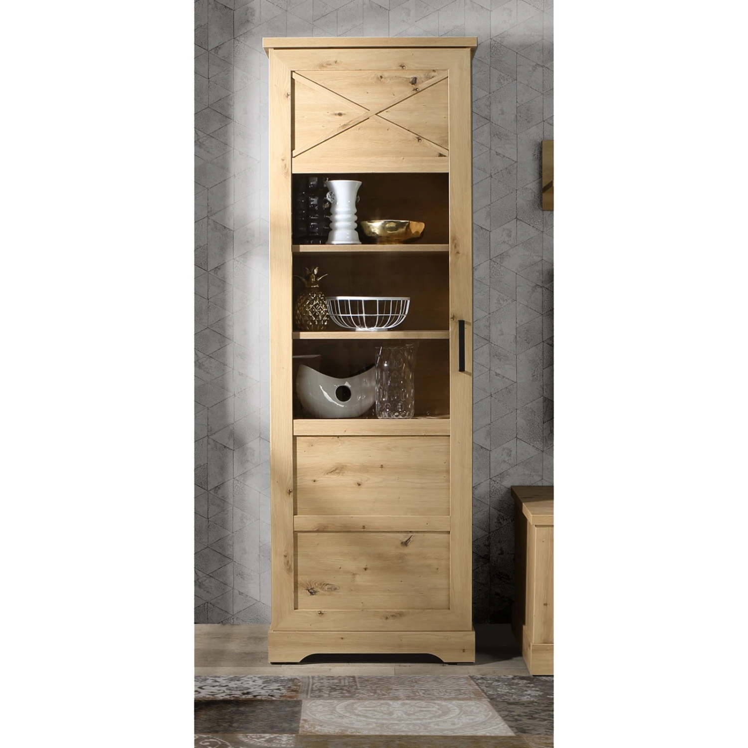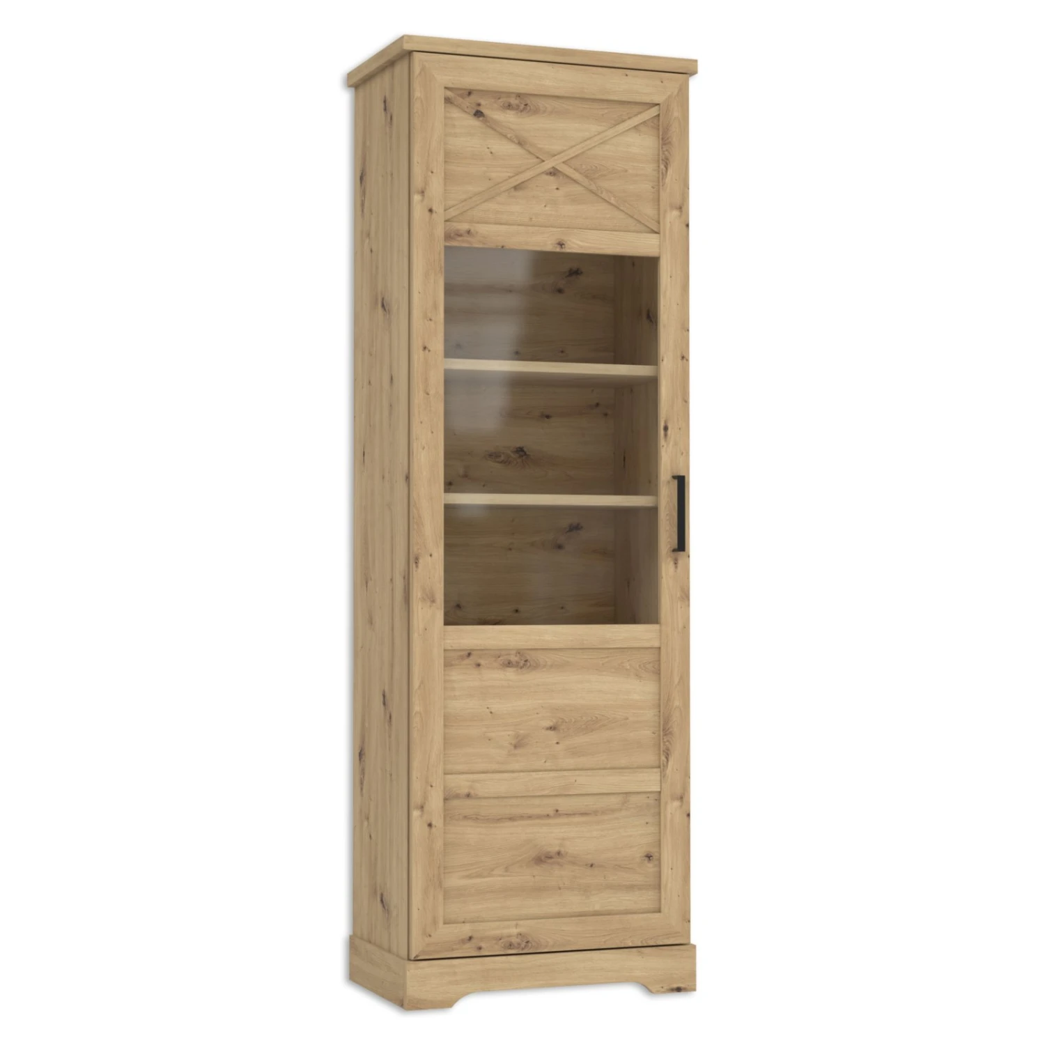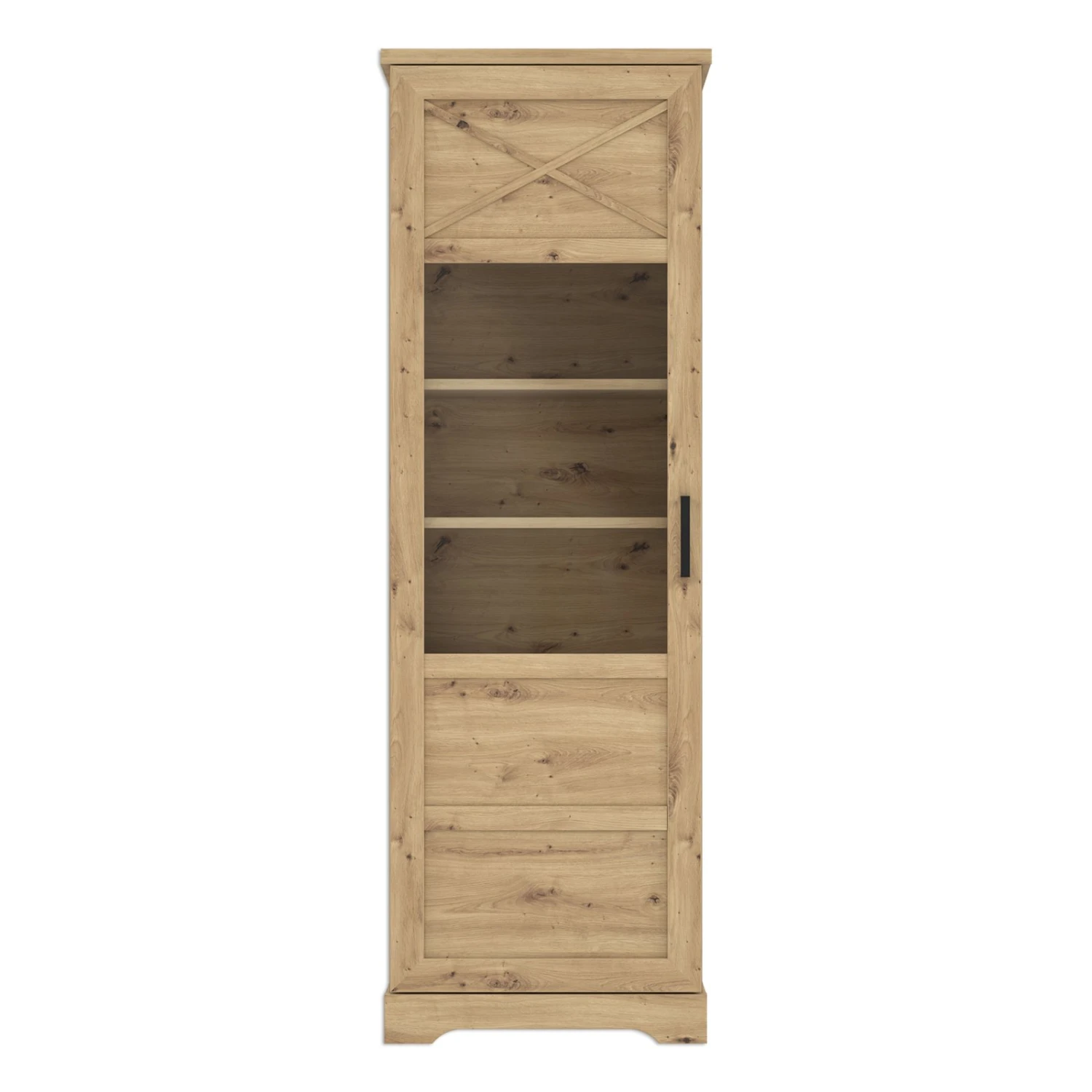 Diese Vitrine hat ein robustes Auftreten. Sie ist aus Holz und in Artisan Eiche Nachbildung gehalten. Hinter der großen Drehtür mit Glaseinsatz befinden sich 5 Einlegeböden, den den Innenraum nützlich aufteilen. Die Griffe sind aus schwarzem Metall.