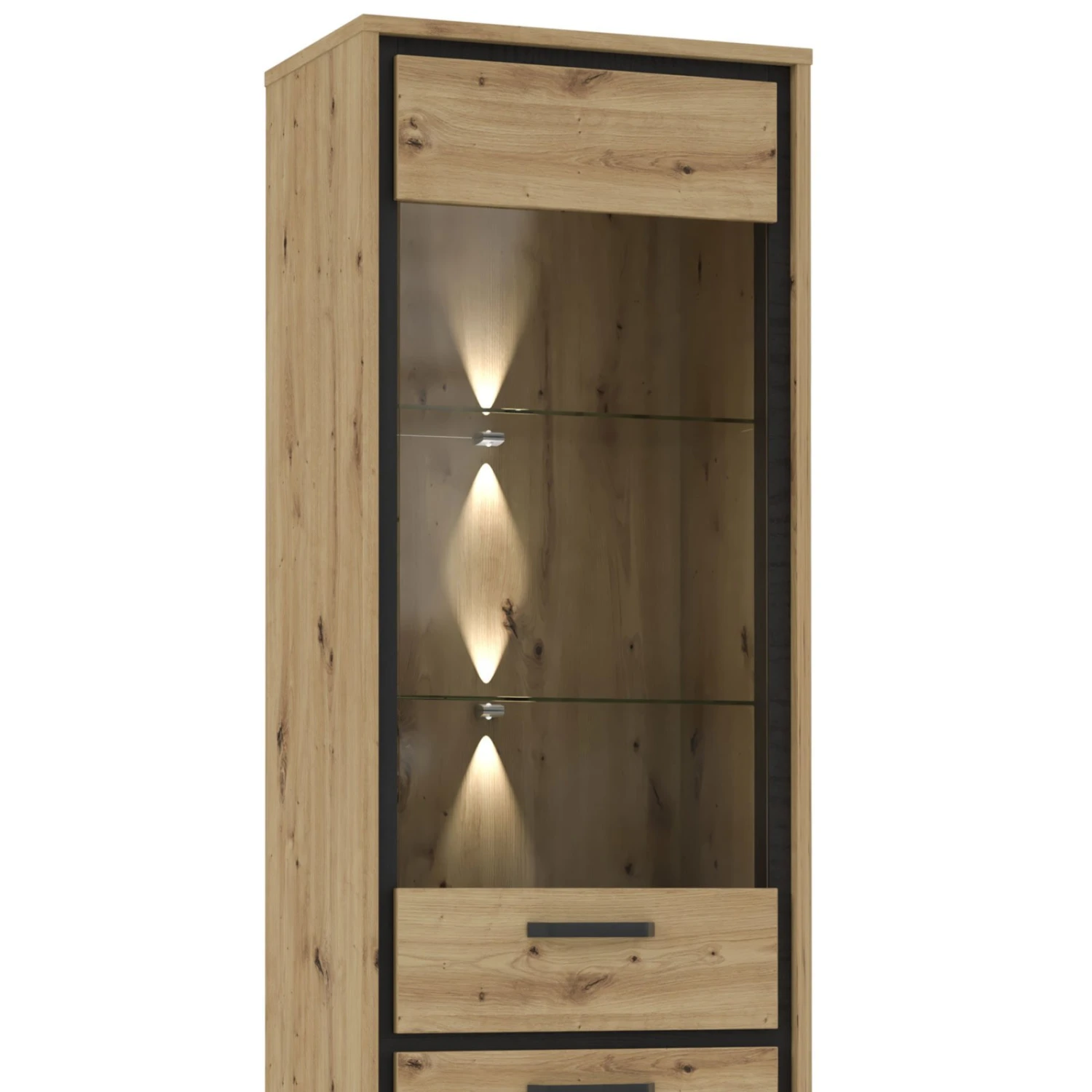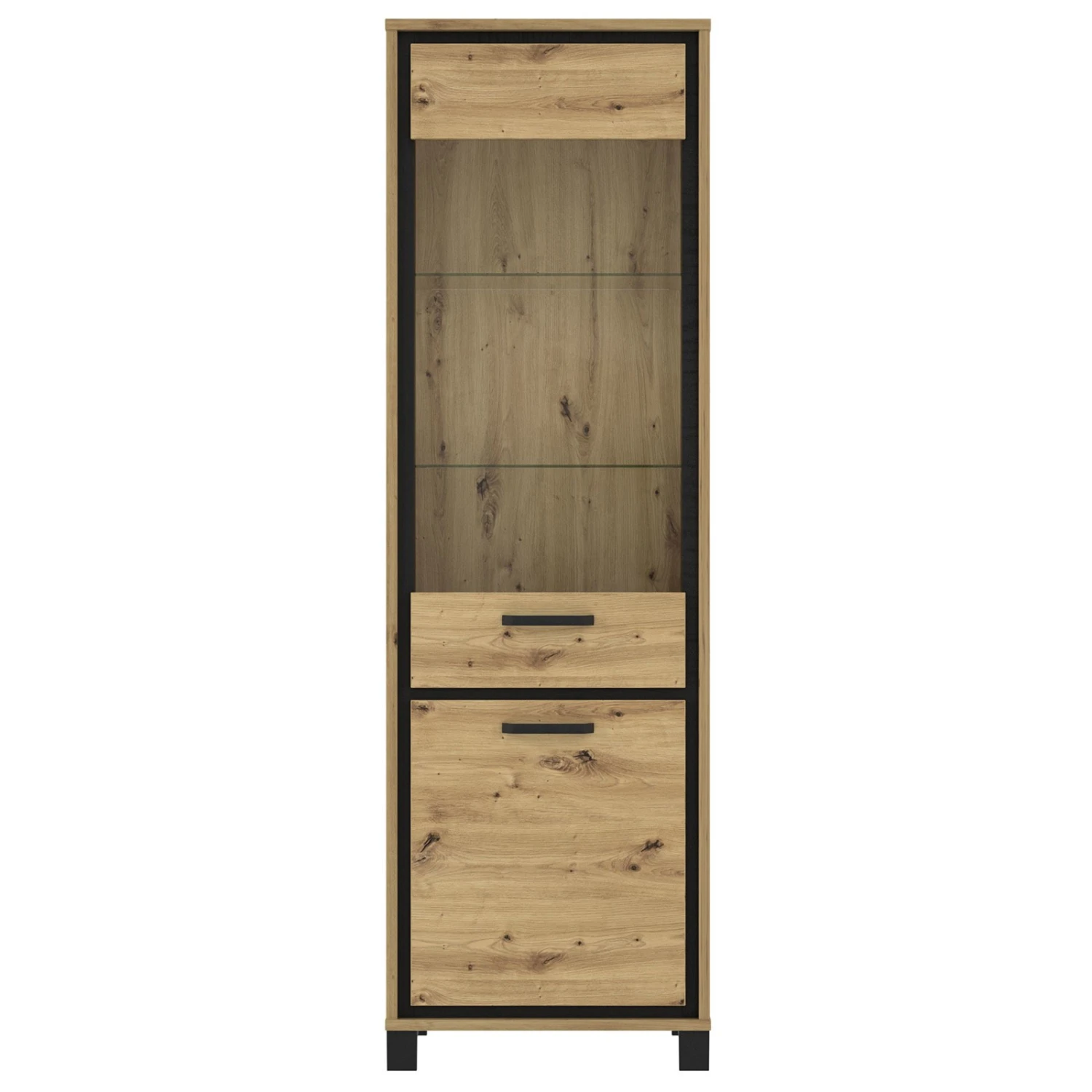 Die zweitürige Vitrine spiegelt den angesagten Industrial Style wider und sorgt somit für Modernität in Ihrem Wohnbereich. Diese tolle Optik erlangt sie druch den Mix aus Artisan Eiche, Schwarzeiche und Metall in Schwarz. Hinter den beiden Türen finden Sie reichlich Stauraummöglichkeiten für die verschiedensten Gebrauchsgegenstände.