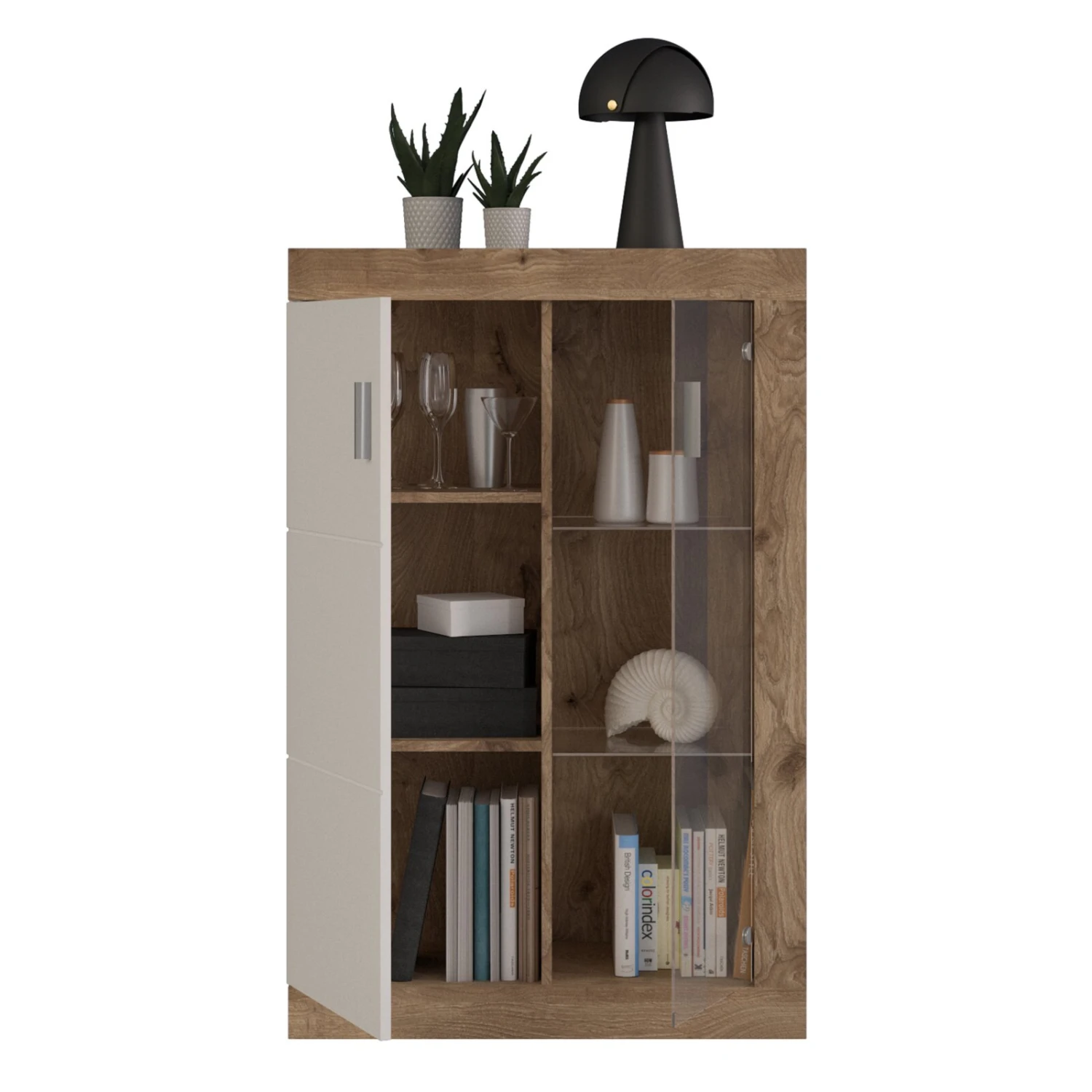 Die schlichte, weiß matte Vitrine mit Absetzungen in Viking Oak Nachbildung verfügt über Tiefziehfronten, die das Gesamtbild optisch auflockern. Hinter einer Tür und einer Glastür lassen sich Utensilien und Dekorationsartikel unterbringen.